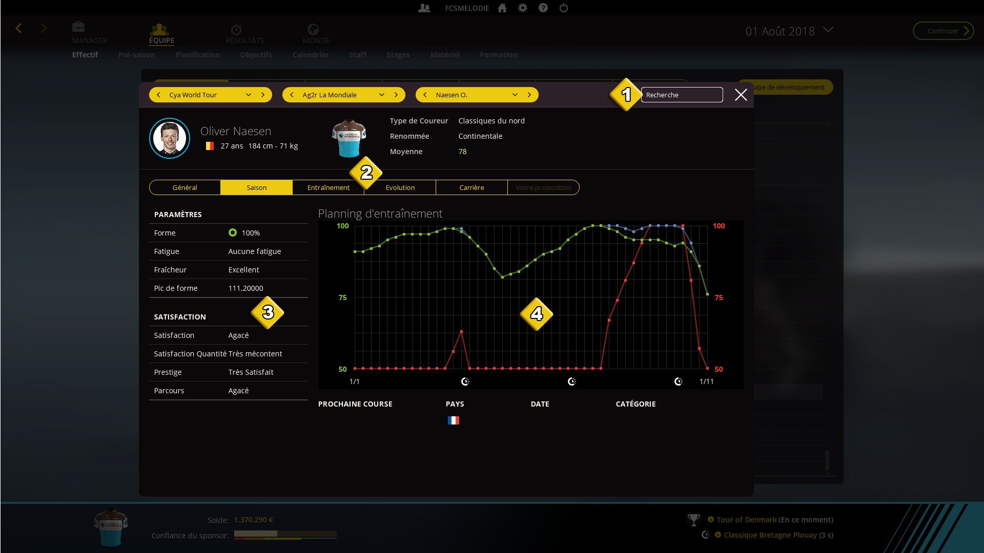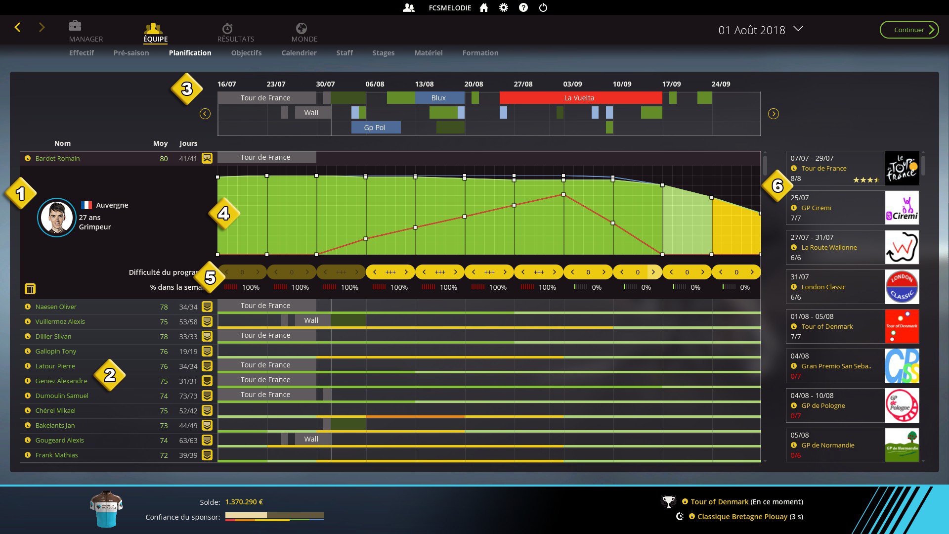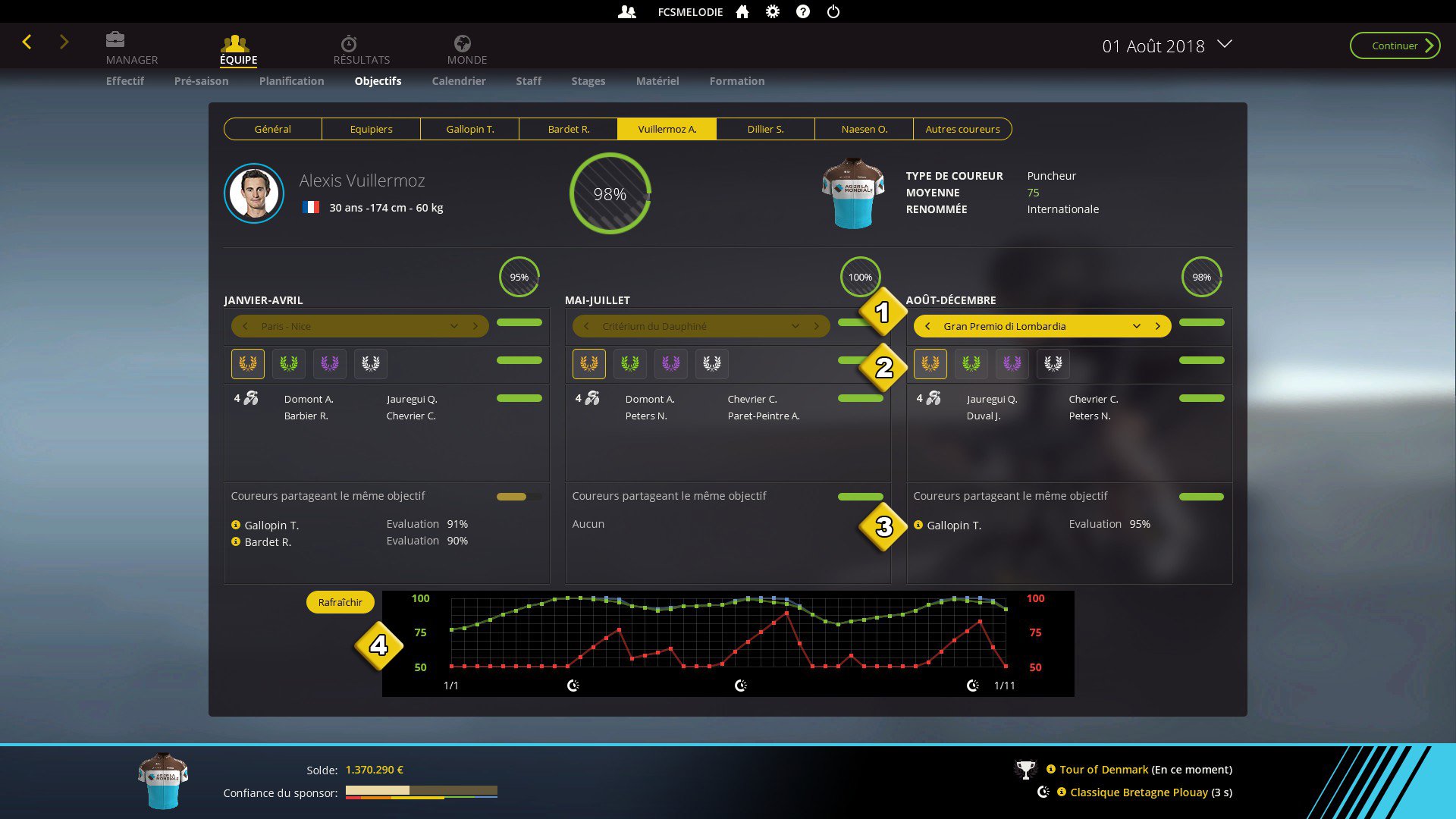 1.Here you can change the objectives for your rider. All races are present; choose them according to their prestige and the interest they represent for your rider. You can make a quick evaluation of their interest by looking at the impact of the choice of race on your leader's satisfaction gauge. A happy rider will be more competitive.