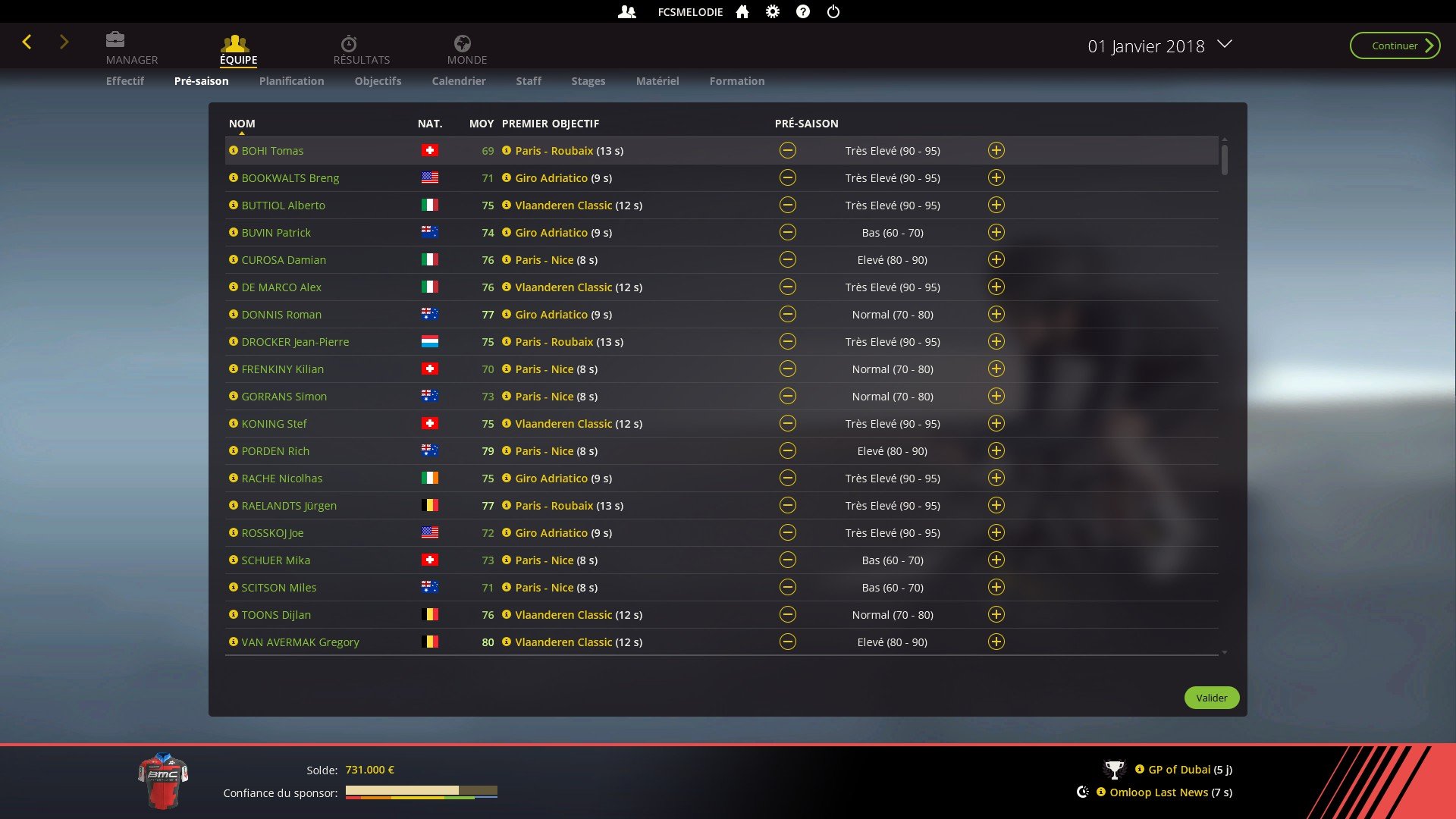 On January 1st of each year, you will be asked to establish the pre-season training rhythm of your riders via the Team>Preparation>Pre-season menu. It will allow them to arrive more, or less, prepared for the start of the season. In a way this corresponds to the investment of the rider in his winter preparation.