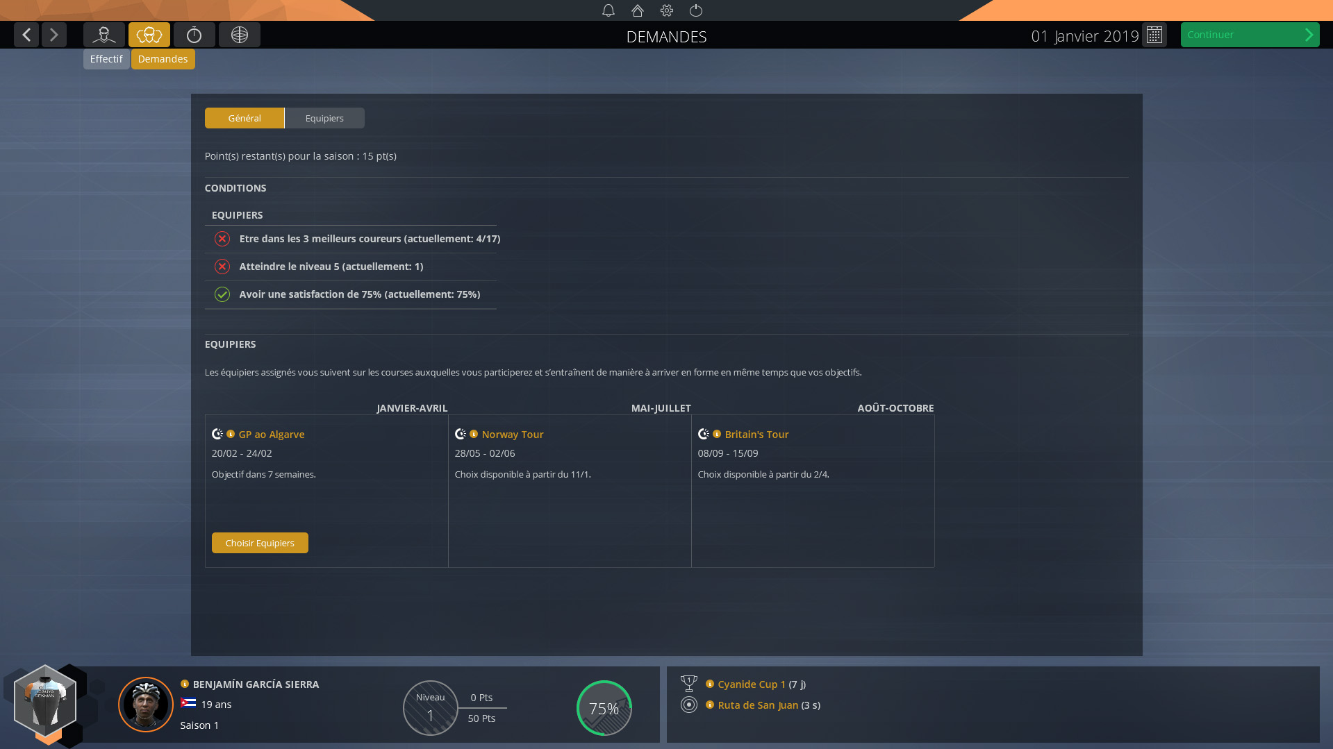 By drawing attention to yourself by your performances and by achieving the objectives set by your manager, you will earn the chance to become a leader within your team. This will allow you to have team-mates with you during races, supporting you all the way to victory. You can thus control them, to some extent during races in order to, for example, set up a sprint train in front of your rider or to protect you inside the peloton. Being a leader also allows you to choose you preferred team-mates for a race, under certain conditions:- be among the best riders in the team.